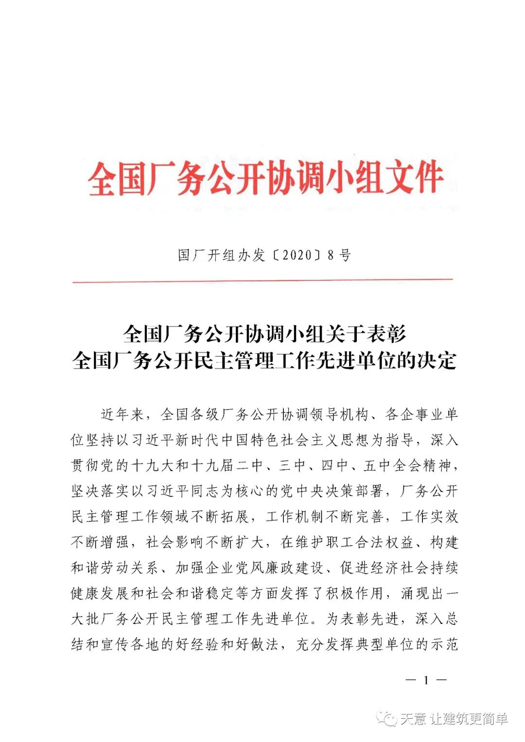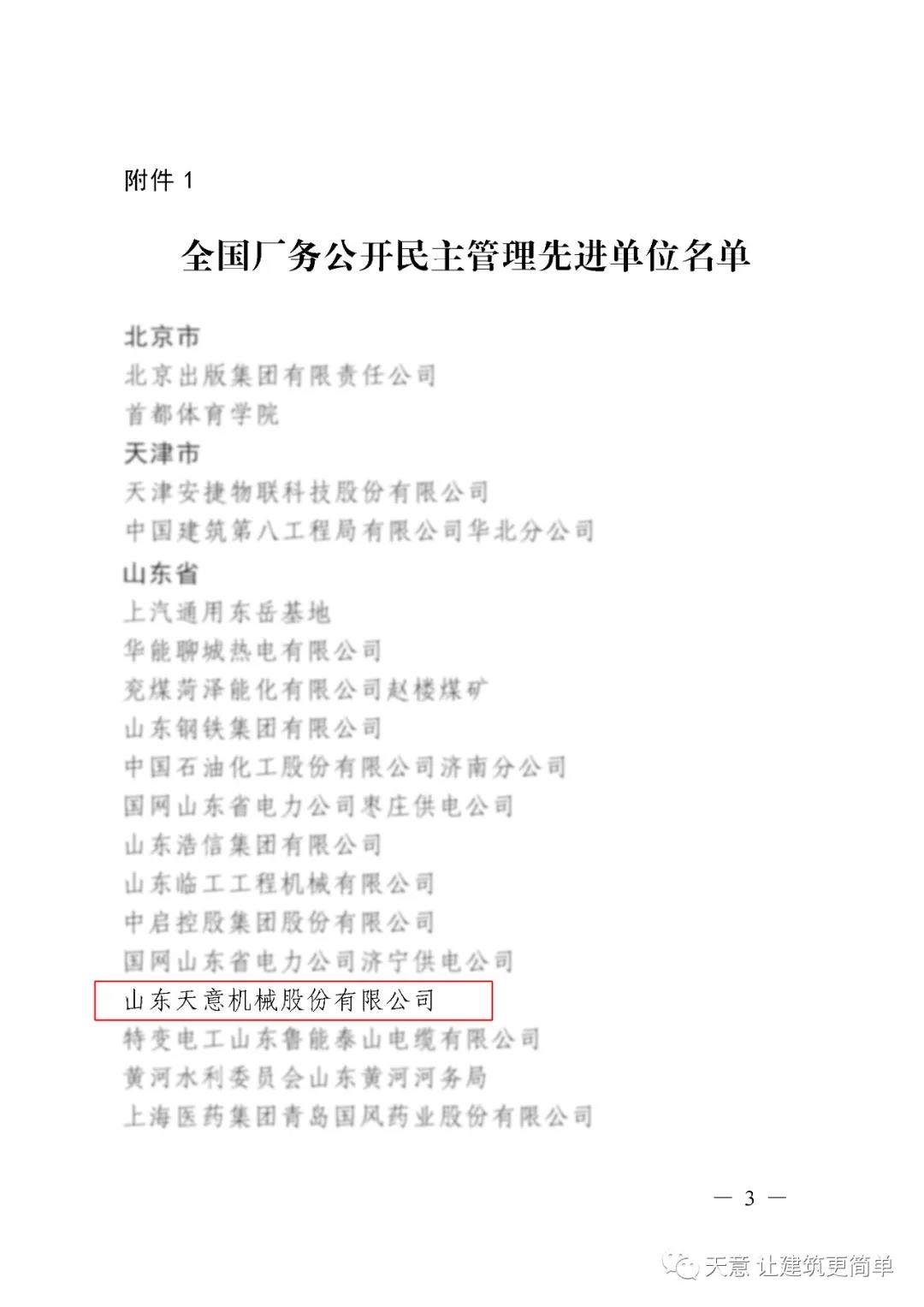 12月11日,從全國總工會傳來喜訊,山東天意機械股份有限公司被授予“全國廠務公開民主管理先進單位”稱號。