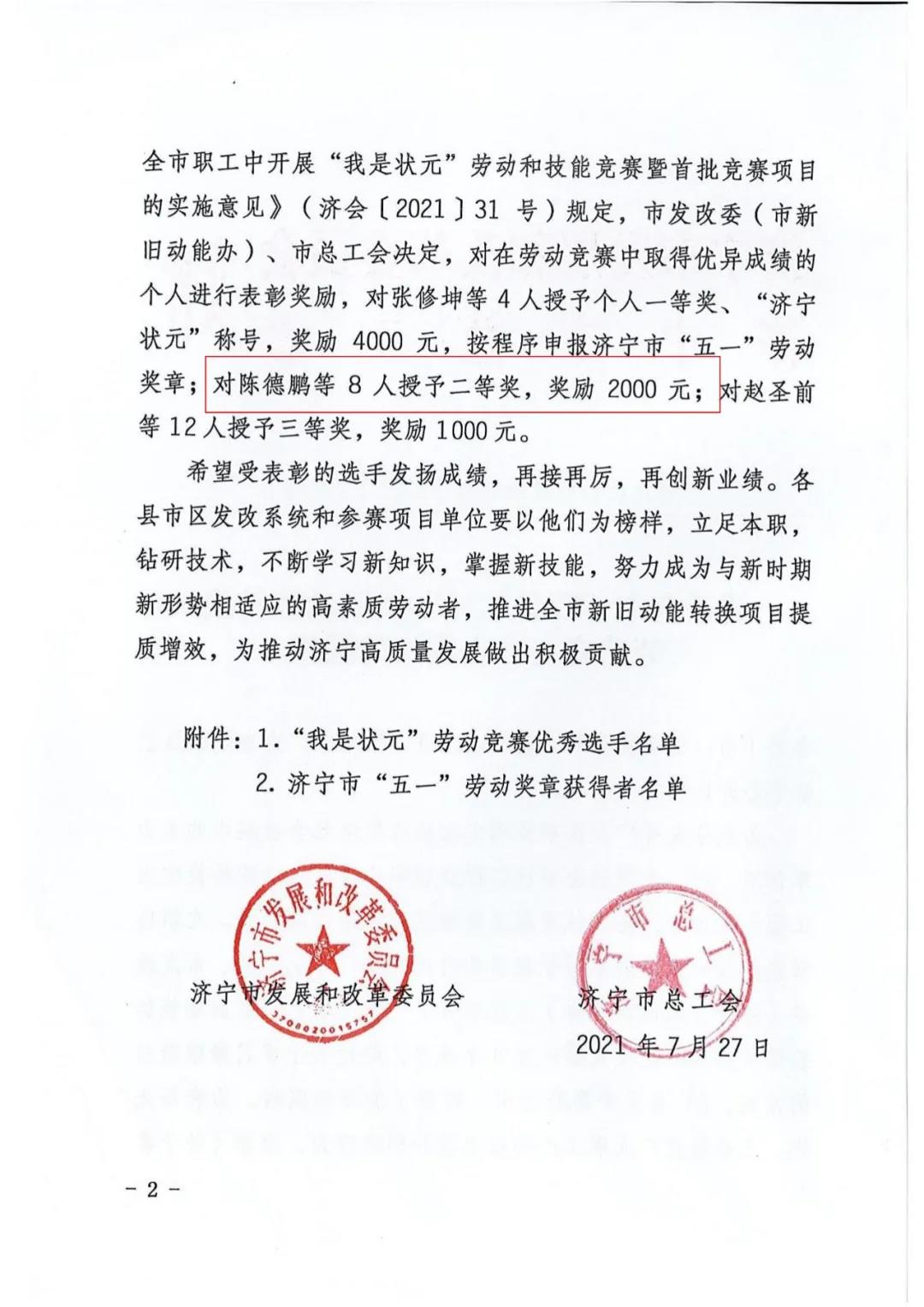 我司陳德鵬獲得濟寧市“我是狀元”勞動競賽新舊動能轉換重大課題攻關競賽單元二等獎
